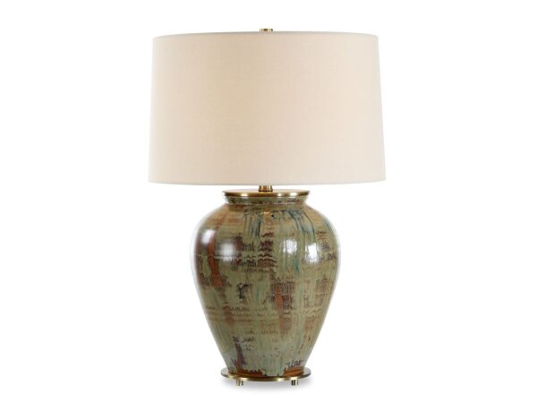 The Olisa Table Lamp showcases a timeless ceramic urn base finished in shades of green, blue-green, and earthy browns, accented