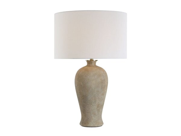 The Dorothea table lamp features a textured ceramic base finished in a aged stone gray with rustic ivory details and
