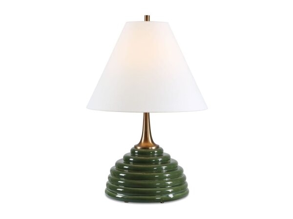 Elevate your decor with this stylish table lamp, showcasing a striking dark green ribbed ceramic base paired with sleek brass-plated