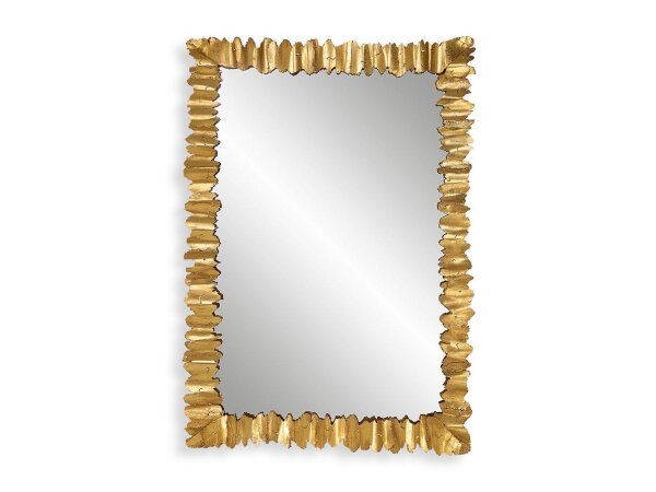 This mirror frame is forged from rounded metal and finished in a heavily antiqued gold leaf. Featuring a floating beveled