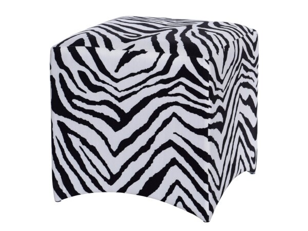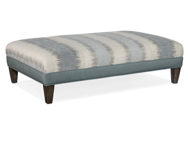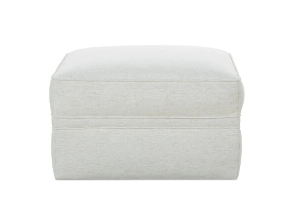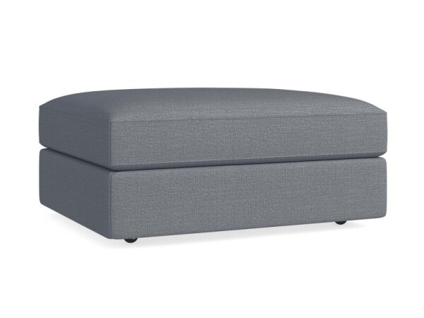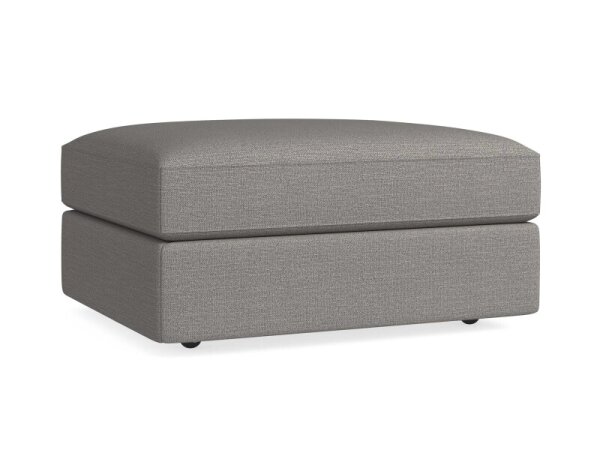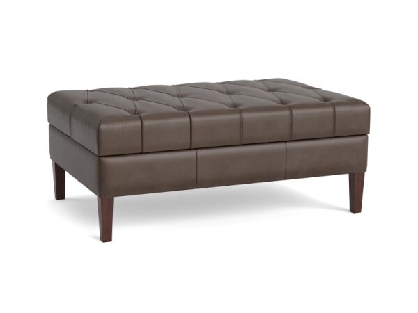Rectangular fabric storage ottoman with a smooth, top-stitched top, roomy concealed storage with spring-loaded hinges and lining, and easy-rolling concealed casters.
