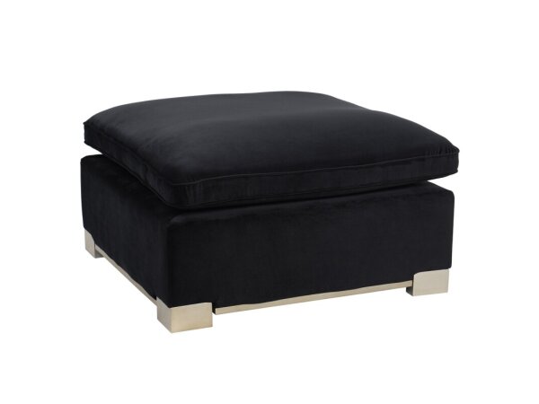 Square fabric ottoman with webbed seating for comfortable lounging or extra seating, a smooth top‑stitched surface, and tall tapered walnut legs; 25 in. W x 25 in. D x 19 in. H.