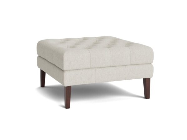 Square upholstered ottoman with webbed seating construction for resting feet, a tray, or extra seating. Smooth top-stitched top and tapered walnut legs; customizable fabric with tufted option; 35 in. square x 19 in. high.