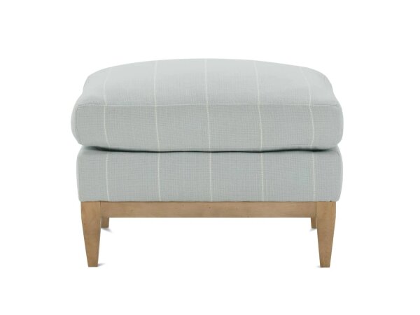 Square leather ottoman with a tailored flange seam and low round legs works as a footrest or compact seat. 20 in. W x 20 in. D x 17 in. H fits small living spaces.