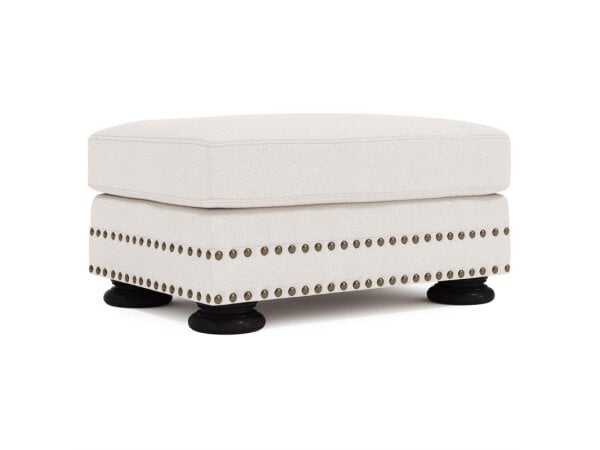 Compact ottoman with clean lines and wedge feet, handy as a footrest, extra seat, or for serving. Fabric upholstery, artisan crafted in the USA; 28 in. W x 23 in. D x 17 in. H.
