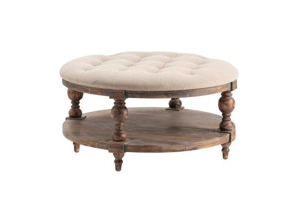 Tradition meets comfort in this Crestview Collection Tahoe Rustic Wood and Round linen fabric Ottoman, with a lower shelf for