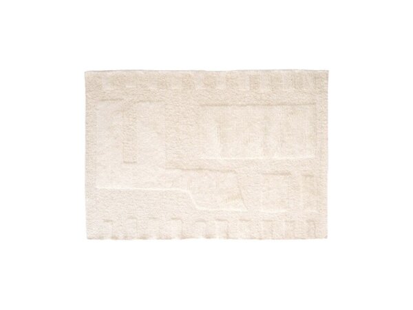 Hand-woven in India from 100% undyed wool with a geometric boho pattern and high-low texture.