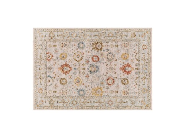Floral-inspired ornamental area rug in a neutral cream palette for versatile styling. Polyester and polypropylene construction.