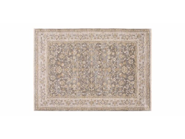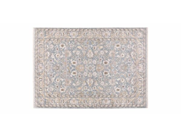 Power-loomed area rug in soft, space-dyed polyester featuring traditional patterns in neutral tones with bluestone and muted amber. Indoor use; rug pad recommended.