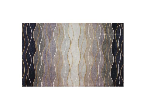 Hand-tufted wool/viscose area rug with a contemporary ombre pattern of curved navy and gray layers accented by thin white and gold lines. Made in India.