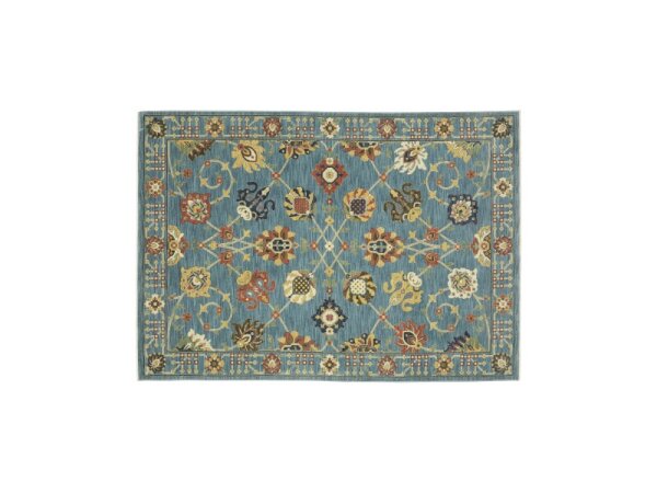 Power-loomed, space-dyed polypropylene area rug with a soft feel. Softened jewel tones of sapphire, turquoise, muted gold, and cinnabar update traditional patterns with open fields and folk-art flair.