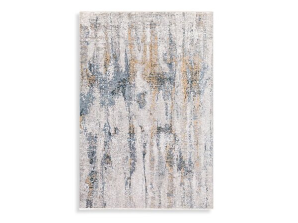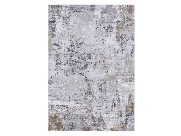 This power loomed rug features an abstract design in multi shades of gray and hints of ivory, with taupe gold
