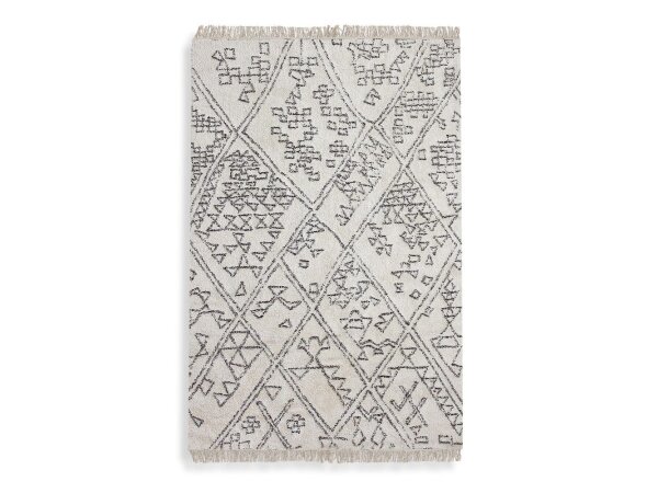 Table tufted ivory cotton, featuring a distressed tribal inspired pattern and a plush pile.