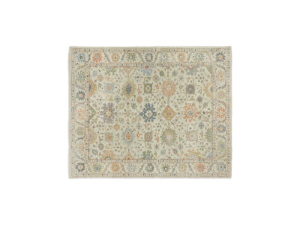 Hand-knotted wool area rug with traditional Oushak patterns in modern, timeless colors for a luxurious, crafted finish.