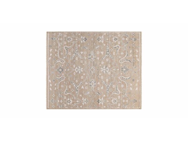 Traditional-inspired area rug, hand-knotted in India from wool-viscose with a low pile for durable elegance. Glue-free construction contains no water‑reactive chemicals for thorough cleaning; spot clean only.