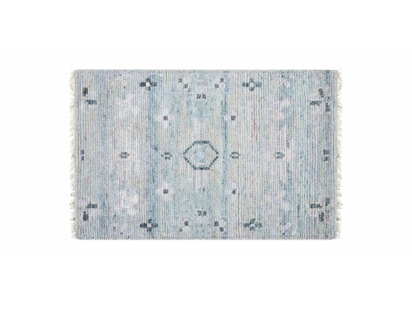 Hand-knotted wool-viscose area rug with a low pile and fringe, blending traditional style with a soft feel underfoot. Handmade in India for a timeless, elegant accent.