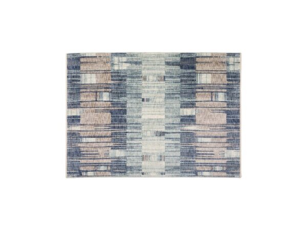 UV-stabilized, fade- and stain-resistant transitional area rug with rich color variation from prismatic processing. Dense, soft polyester pile with built-in non-skid rubber backing; outdoor rated and rug pad not required.