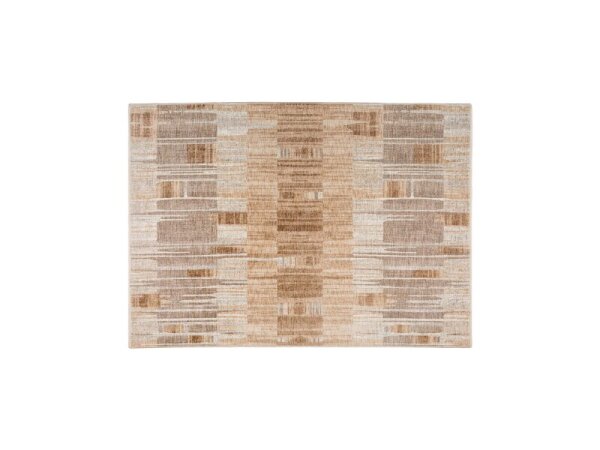 Polyester area rug with an abstract motif, tight low pile, and a soft, velvety feel. Rich warm tones and an easy-care short fringe suit everyday living.
