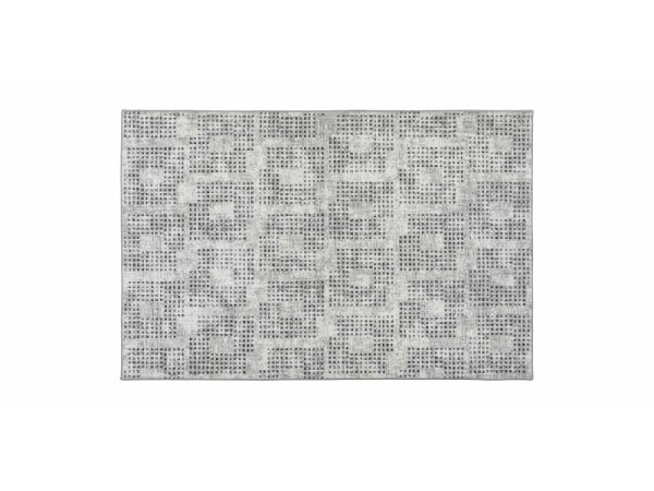 Multi-tonal geometric area rug with UV-stabilized, fade- and stain-resistant polyester for lasting color. Heavy, dense pile with soft feel and a cushioned non-skid rubber backing; suitable for outdoor use.