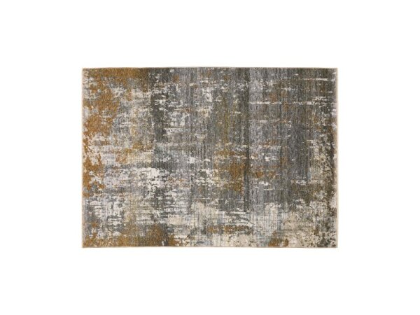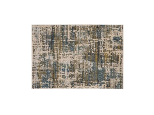Power-loomed, space-dyed polyester area rug with modern abstract design and small fringe. High-density, low-profile build adds refined dimension to living spaces.