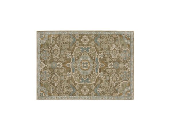 Power-loomed polypropylene area rug with Persian and block-print inspired patterns in neutral and mineral tones; space-dyed fibers provide a soft feel. Size 39 x 60 in.