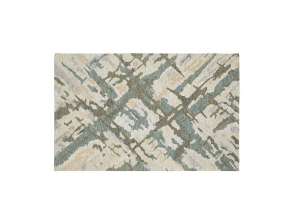 Power-loomed microfiber polyester area rug with a dense pile and super-soft hand. Oceanic blues, celadon, mink, saffron, ivory, and off-black suit modern or casual decor.