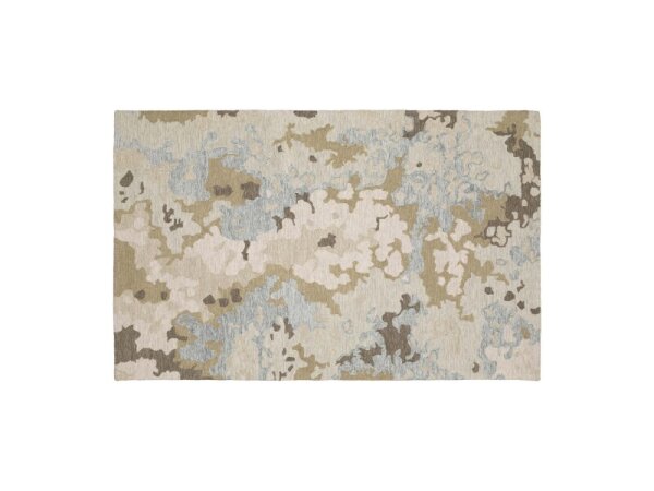 Hand-tufted wool area rug made with space-dyed yarns and a dense, multi-level loop pile. Organic, layered pattern in softly saturated blues and greens with copper and gold accents.