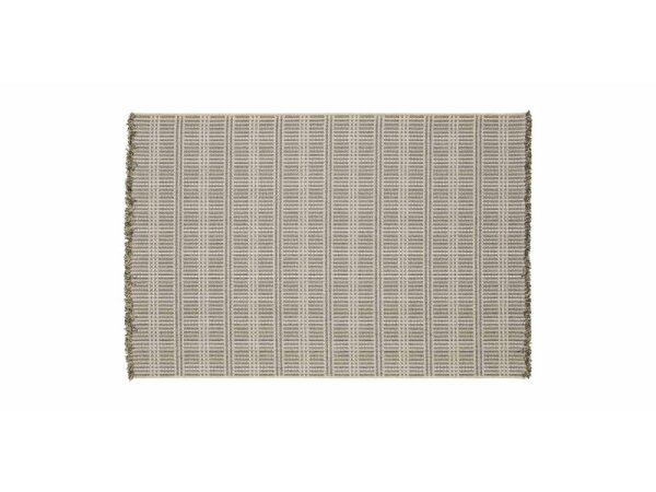 Flatwoven polypropylene area rug with subtle, globally inspired patterning in gray, ivory, and black. Power-loomed performance design with fringe, easy care for high-traffic spaces.