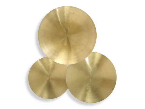 Iron wall discs with an elegant plated brass finish. A modern, minimalist design for any interior. Sizes: Sm-27.5×3, Med-23.5×4, Lg-20×3