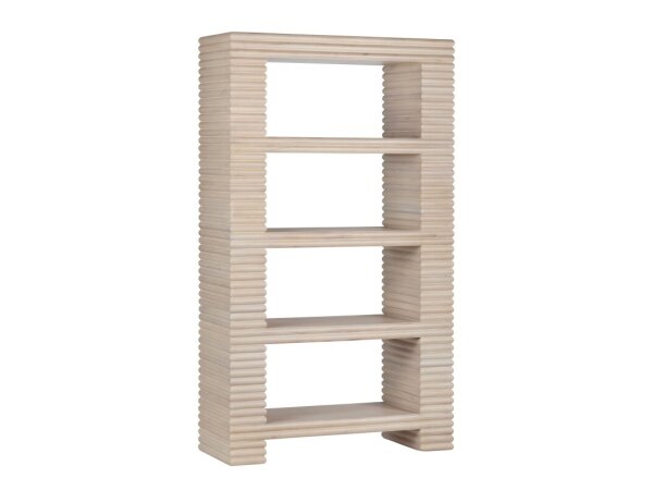 This Tanners Creek 72" bookcase is crafted from melamine and a rubberwood solid frame, featuring a scratch-resistant greystone finish. It includes five shelves, an "X" accent, and open ends with a dark pewter metal finish for display.
