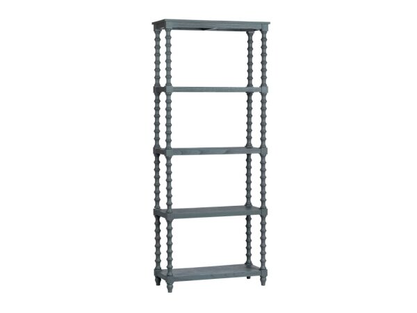 This unique Trellis Lane accent bookcase is crafted from solid mango wood with a weathered grey finish and hand-carved end panels. It offers five shelves for storage, anchored by block legs.