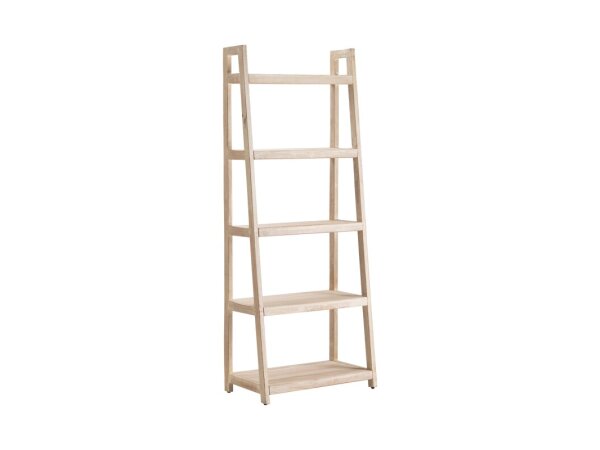 A Magnolia Manor leaning pier bookcase featuring 5 graduated shelves for storage and display. It is crafted from rubberwood solids with white oak and birch veneers, showcasing an antique white and weathered bark two-tone finish.