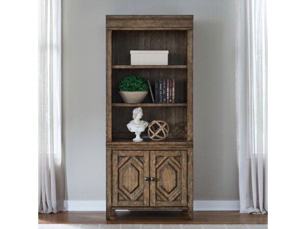 This 74" Stone Brook leaning bookcase is made from poplar solids and white oak veneers with a rustic saddle finish and light distressing. It offers six shelves for ample storage and can stand alone or pair with a credenza.