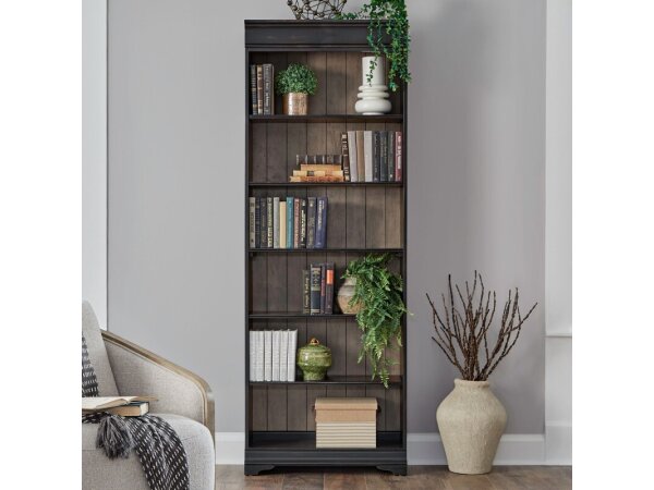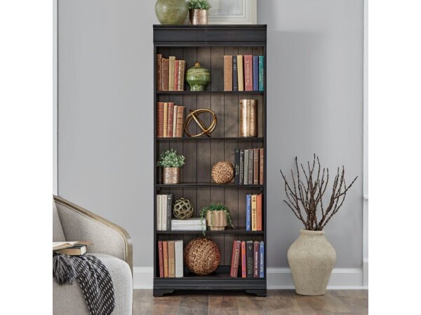 Meticulously crafted using Poplar solids with Birch and Maple veneers, this 84-inch bookcase features an Aged Charcoal and Caramel finish. It offers five adjustable wood shelves for customizable storage.