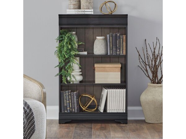 Constructed from Poplar solids with Birch and Maple veneers, this 48-inch bookcase has an Aged Charcoal and Caramel finish. It offers two adjustable wood shelves for organized storage.