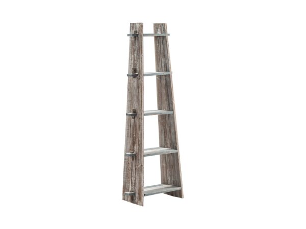 This Americana Farmhouse leaning pier bookcase is crafted from poplar solids and white oak veneers with a Wire-Brushed Dusty Taupe finish. It features five graduated shelves and turned bun feet, offering a distinctive display and storage solution.