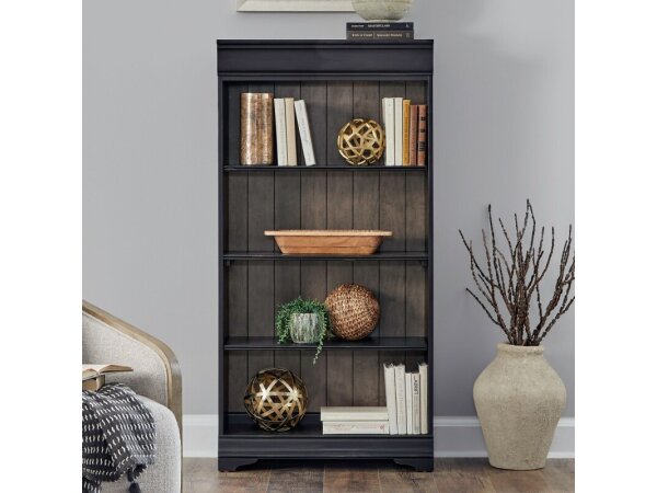 Crafted from Poplar solids with Birch and Maple veneers, this 72-inch bookcase showcases an Aged Charcoal and Caramel finish. It includes four adjustable wood shelves for flexible storage solutions.