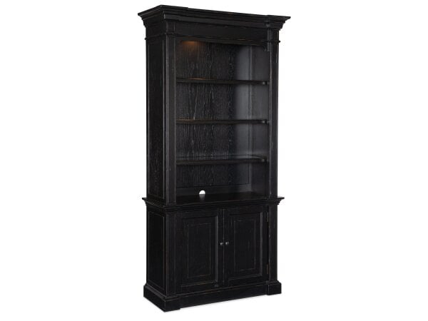 Tuxedo-black pecan veneer bookcase with two doors, adjustable shelves, and an integrated puck light with touch switch. Includes anti-tip hardware for added safety.