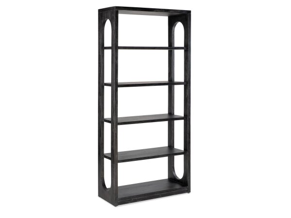 This unique Trellis Lane accent bookcase is crafted from solid mango wood with a weathered black finish and hand-carved end panels. It offers five shelves for storage, anchored by block legs.