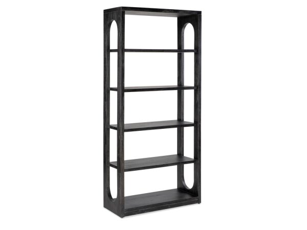 Tall etagere bookcase in black mindi veneers with visible grain. Four open shelves provide casual display and storage for home office or living spaces.