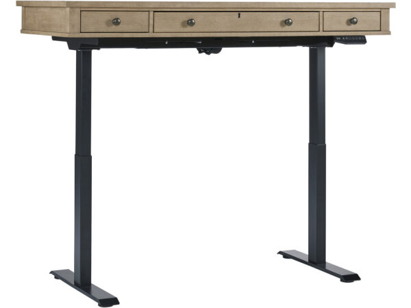 Writing desk in Cathedral Oak veneers with 3 drawers, including a drop-front keyboard drawer, removable pencil tray, and a writing slide, plus built-in power. Casual clear oak finish with champagne-colored hardware.