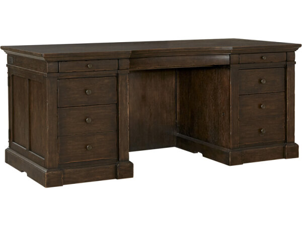 Junior executive desk with 7 drawers including locking file drawers and a drop-front keyboard drawer, plus two pullout writing slides; finished on all sides. Claro-finished Cathedral Oak veneers with champagne-colored pulls and knobs.