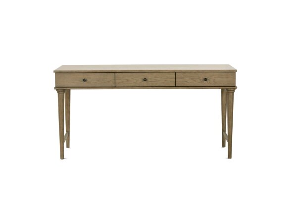 Creamy white writing desk wrapped in lacquered grasscloth with raffia and wood accents, offering 3 drawers with removable writing slides, pencil trays and dividers. Center drop‑front drawer supports keyboard use with rear wire access.