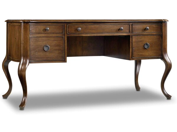 Traditional writing desk in rustic Pecky Pecan veneers with cabriole legs and a bonded leather top insert. Includes wire management and four drawers: keyboard, file, utility with writing slide and pencil tray, plus hidden-storage false-bottom.