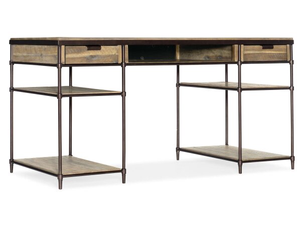 Industrial-style writing desk in light natural acacia with an antique bronze metal frame, featuring 2 drawers with a removable writing insert, pencil tray and dividers, plus 4 shelves. Center open area accommodates a keyboard.