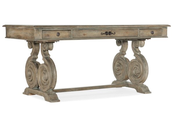 Writing desk with a scroll base and sun-washed rustic finish, featuring a center drop-front keyboard drawer. Two additional drawers include a removable writing insert, pencil tray, and adjustable dividers for organized storage.