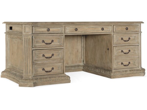 Traditional executive desk with a drop-front keyboard drawer, wire management, and abundant storage including utility drawers and two locking file drawers with Pendaflex letter/legal. Finished in warm pecan over Pecky Pecan veneers with antique bronze har