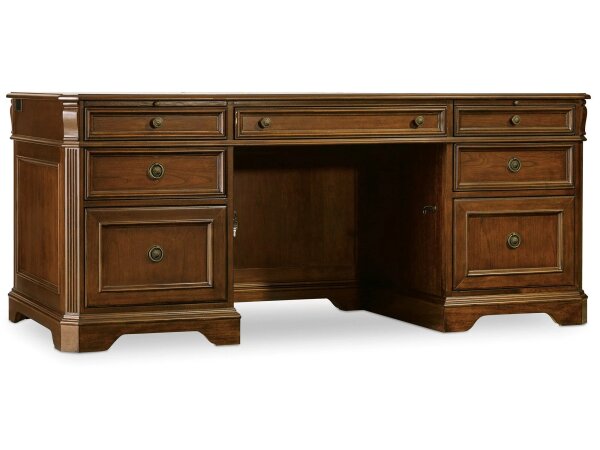 76 in. executive desk with a bonded leather top and carved leather panel insets with nailhead trim. Provides 7 drawers including two file drawers, a drop‑front keyboard drawer, and pullout writing slides.