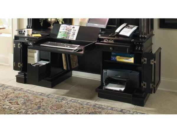 Computer credenza in a black finish with scroll‑motif trim, offering media storage drawers and a power supply. Includes a keyboard tray with document rest, removable partitions, utility drawers, and an adjustable shelf.
