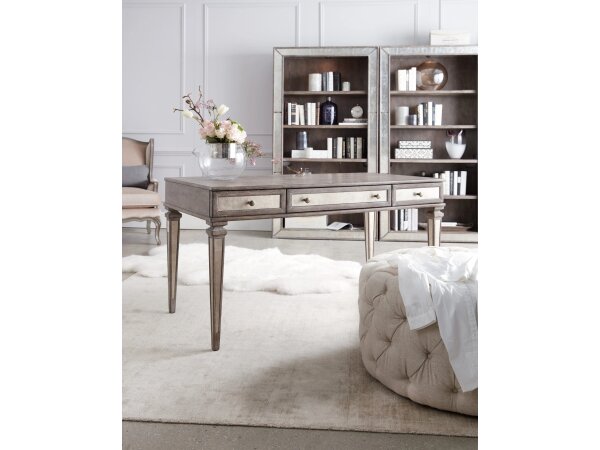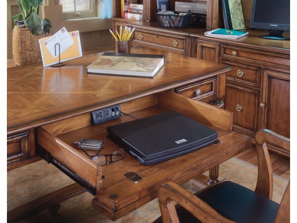 60 in. x 30 in. leg desk in distressed cherry veneers with fluted legs and a curved stretcher. Center drop-front keyboard drawer, two utility drawers and a power supply support home office work.